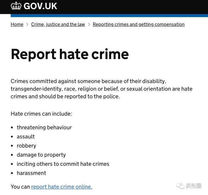 图:英国政府官网据英国政府网站,歧视行为包括但不限于:言语或者身体上的暴力(verbal and physical abuse)霸凌(bullying)威胁(threatening behaviour)网络暴力(online abuse)损毁财物(damage to property)英国警方《仇恨犯罪受害人帮助手册》给出大家遇到歧视时的几点建议在紧急情况下(人身安全及财产当下受到威胁)时: