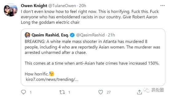 “都不知道是什么感觉。这太恐怖了,去**的,让我们国家的种族主义者变得更胆大妄为的人都去死吧。快把他送上电椅。”