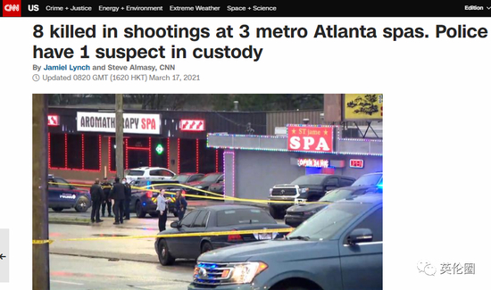 CNN:发生在亚特兰大的3个都市水疗中心的枪击事件,8人死亡。警方拘留了1名嫌犯
