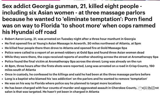 图:CNBC在美国当地时间周三早上,警方称嫌疑人也自称是按摩店的常客,并且可能有性瘾。