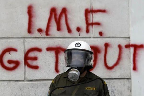 2010年5月5日,在雅典民众针对紧缩措施的示威游行期间,一名希腊防暴警察站在写在银行墙上的涂鸦前