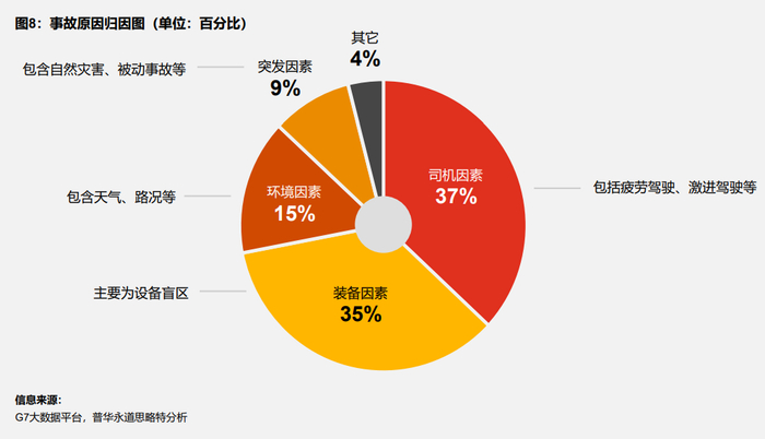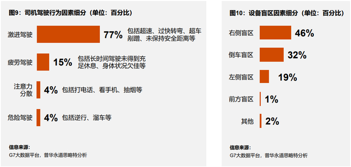 卡车司机不当驾驶行为和设备盲区是导致事故发生的主要因素。在司机因素方面,激进驾驶行为导致的事故数量最高,在司机原因导致的事故中,激进驾驶行为占比接近80%,除此之外,疲劳驾驶为第二大因素,导致的事故占比为15%。