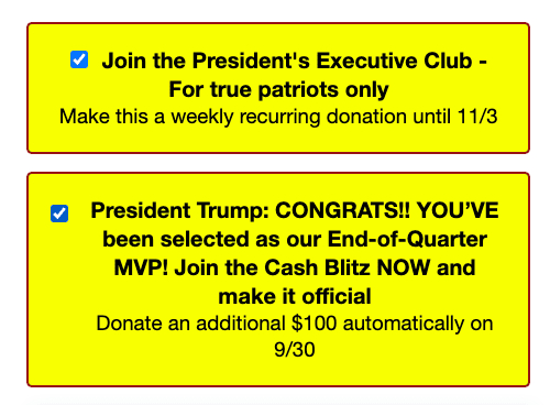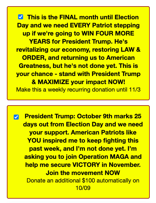 而随着大选日临近,特朗普竞选团队在网站上增设了第二个预选框——可自动扣取更多捐赠金额,并用粗体和大写字母分散捐助者的注意力,让捐助者难以留意和取消该默认选项。