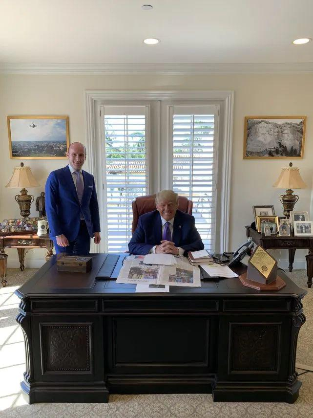 4月6日,特朗普的另一位高级顾问史蒂芬·米勒(Stephen Miller)发布了与他的合照,曝光了特朗普位于海湖庄园的新办公室,显示出他对总统生活的无限留恋。