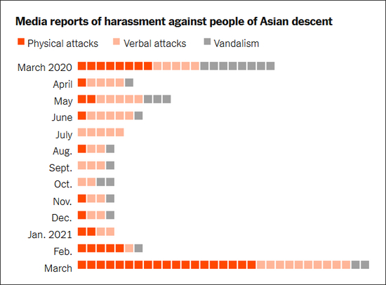 《纽约时报》整合了一年来亚裔美国人遭受攻击骚扰的媒体报告,红色为肢体攻击,浅色为口头攻击,灰色为财物受损