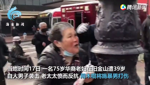 谢肖珍老人在旧金山市中心区域等红绿灯时被袭击,老人当即手持木板奋起反击,把对方打得头破血流,这名白人男子最后被打趴下,还被担架抬走送往医院,让不少亚裔群体感到大快人心。