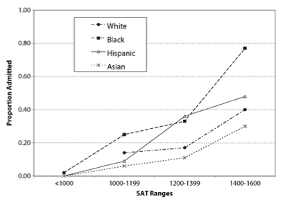 在该书中,作者通过对12,000余名大学申请者的数据进行分析后得出结论,进入精英大学的亚裔学生的 SAT平均分数比白人学生高140分,比拉丁裔学生高270分,比黑人学生竟然高450分!