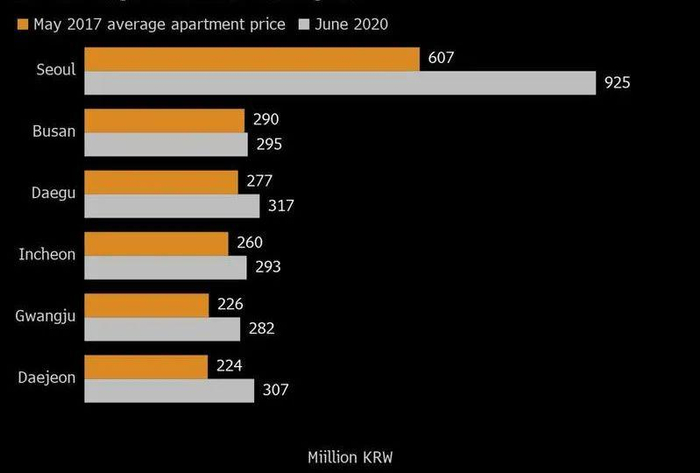 各大城市公寓平均房价的2020年6月与2017年5月对比,其中首尔的房价涨幅惊人(统计:彭博社,数据来源:韩国国民银行)