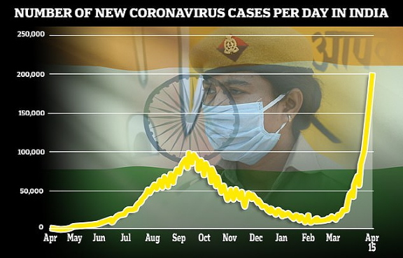 印度正在跌落于悬崖,并且没有降落伞。进入四月下旬,印度的新冠疫情正呈现排山倒海之势。印度日新增患者从4月10日后的每天15万人开始急速上升,到20日这一人数上升为29.4万,当天死亡2000多人。4月21日,印度每日确诊病例已超30万。目前,印度境内平均每小时增加1万例确诊病例、60例死亡病例。印度以累计1,560万例确诊、超过18万人死亡的数字排在美国之后。据CNN报道,在印度古吉拉特邦,火葬场连轴转,燃气炉和柴火炉运转时间太长,导致金属零件都开始熔化了。首都新德里一日狂增2万多新病例,在当地接受核酸检测的人当中,新冠阳性率达三分之一,人口超过2000万的新德里,目前只剩下不到100张重症监护病床。为了防止卫生系统的崩溃,新德里宣布从19日晚10点开始为期6天的全面封锁模式。在西部马哈拉施特拉邦,新冠患者每天需要1,550吨氧气,但该州只能生产1,250吨氧气。屋漏偏逢连夜雨,4月21日,在一家医院里,因为主氧气罐泄漏,导致数十名重病患者断氧,20多人丧生。因为医院床位不够,两个病人不得不同躺在一张床上,共用同一台呼吸机。患者不但不知道旁边躺的人是谁,也不知道旁边的人是生是死。
