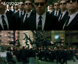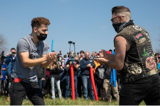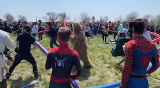 几分钟后,这些“Josh”们开始挥舞彩色塑料棒互相攻击,身处中心位置的两人,甚至在众目睽睽之下玩起了“石头剪刀布”,在不知情的普通市民眼里,这堪比2021年度人类迷惑行为大赏。