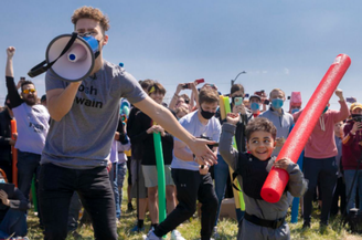 如果仔细观察这些人的外形,就会发现他们中多数人胸前都贴着一个相同的名字“Josh Swain”,举着相似的招牌“Go Josh”,喊着相同的口号“I am Josh”。