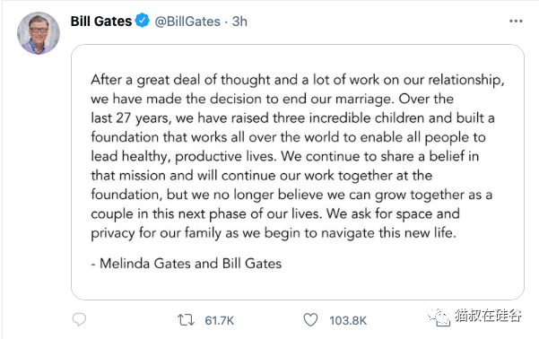 还有一点,盖茨夫妇还在2010年发起签署了捐赠承诺,承诺在生前捐出绝大多数资产用于慈善事业。不过,盖茨并不是要一次性捐出天价资产,而是每年捐几十亿美元的方式进行。虽然他们已经累计捐出了600亿美元,但与此同时,盖茨所持资产还在不断增值,所以哪怕他已经捐出了这么多,现在还有1200多亿美元资产。两人离婚之后会怎样继续执行捐赠承诺,也是外界关心的事宜。