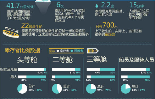 航行第4天,泰坦尼克撞上冰山,船体进水,开始下沉。救生船所在的位置,离头等舱很近,而三等舱的乘客想要活命,需在混乱的人群中穿过迷宫般的走廊,到甲板上登船自救。数量有限的救生艇,显然救不了所有人,按照规定,左舷的救生艇只允许妇孺进入,右舷的救生艇妇孺优先。事故之后的统计也印证了这两点:妇女儿童的幸存率,高于男性;头等舱的幸存比例,远高于二等舱和三等舱。