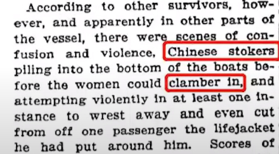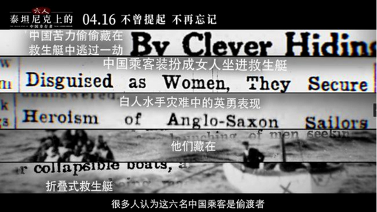 《纽约时报》最先报道,“有人提到意大利和中国炉工的暴烈举动,他们从甲板跳进救生艇,踩伤了艇中的女乘客”,同时又自相矛盾地写道,“中国司炉工抢在妇女们之前蜂拥而入救生艇。”随后又在题为《中国偷渡客》的报道中大胆发挥想象力,“中国人用披巾把自己遮起来,让船员误认为他们是女人。”问题是,这几个中国人都是手持船票的普通乘客,并非偷渡者,而关于他们假扮女性,更是毫无依据。《布鲁克林鹰报》表示,“没人能说清这些中国人从哪里冒出来的,也不知道他们是怎么上了救生船的,但他们却好好地坐在里面。”对此,泰塔尼克号的二副莱托勒在听证会上说,“他们出发时,在(救生艇)座板下发现了四个中国佬”;在另一场听证会上,他的说法是“第二天早上才发现”。但调查发现,他当时并不是那艘救生艇的负责人。更关键的地方在于,纪录片团队1:1建造了这艘折叠式救生艇,发现座板下根本不能躺下4个人。