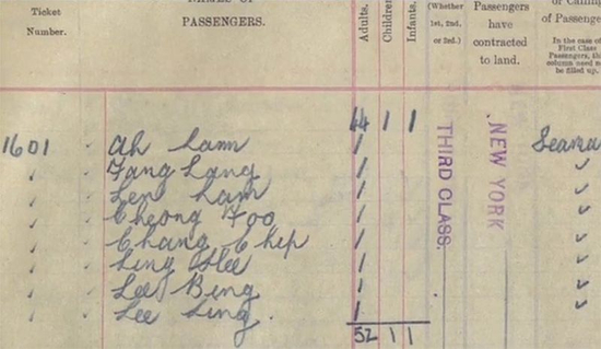 这8名中国人则窝在狭窄封闭的三等舱里,他们看不见日出日落,听不到歌舞升平,感受不到海风拂面,满心希望的,也只是明日的生计。他们原本是英国一家轮船公司从香港和广东沿海雇来的的锅炉工,受英国煤炭工人罢工事件的影响,失去了原来的生计,公司安排他们到停泊在纽约港的另一艘货船上,补充空缺岗位,工资也只有白人船员的1/5。8人共用一张船票,名字是手写的英文名:Ah Lam、Fang Lang、Len Lam、Choong Foo、Chang Chip、Ling Hee、Lee Bing、Lee Ling。
