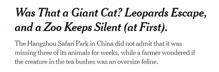 杭州的豹子,依然在不为人知的地方游荡。据《新京报》说,当地出动了近四千人去寻找它,声势浩大。关注这件事情的人,更是不计其数——不止杭州本地,也不止中国网友,杭州豹子的故事,已经传遍了世界。《纽约时报》说:那是只大猫?金钱豹逃窜,动物园保持沉默(一开始)。