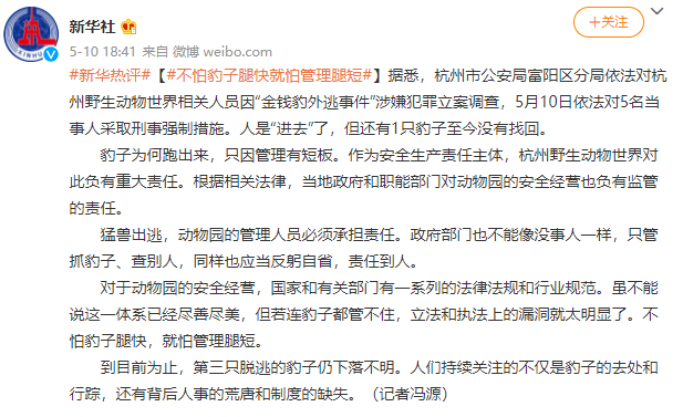 嗯,基本关注的,都是杭州野生动物世界的“瞒豹”行为。据当地官方披露:4月19日,三只豹子就跑了。他们担心会影响五一期间的营业,决定把这事儿压下来。据媒体测算,豹子出逃期间,杭州野生动物世界赚了近5000万。直到五一假期过了,眼看也瞒不住了,这才决定公开。不是不豹,时候未到啊。