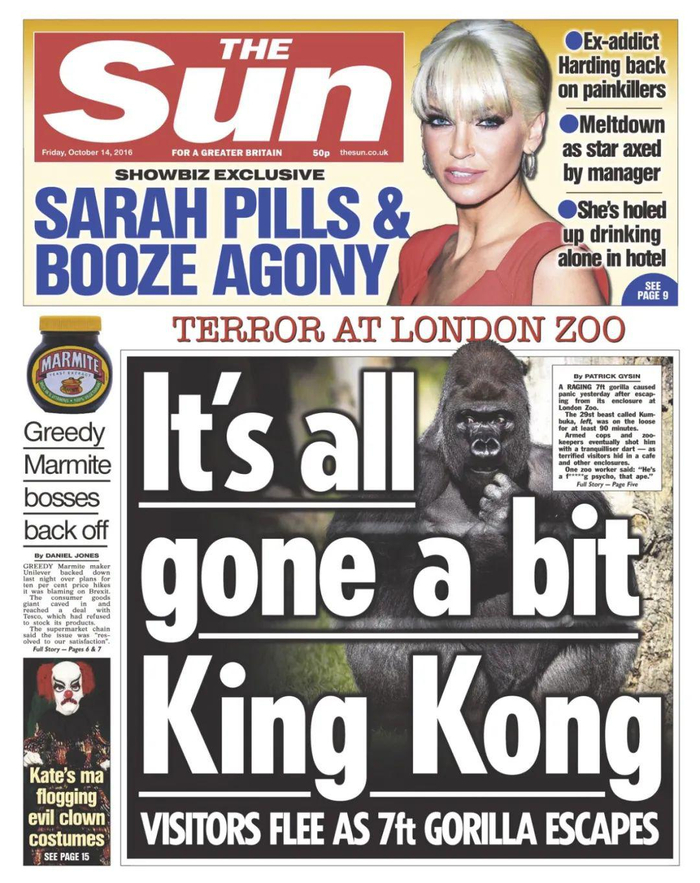 2016年,伦敦一家动物园里,有一只大猩猩被游客激怒,它直接撞破了玻璃围栏,越狱了。看热闹不怕事儿大的《太阳报》,在头版吓唬英国人民:有点金刚内味儿了!