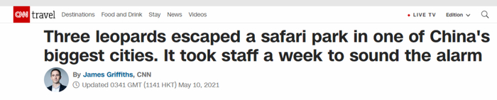 CNN说:三只金钱豹从一家中国大城市的动物园逃出,花了一周才拉起警报。