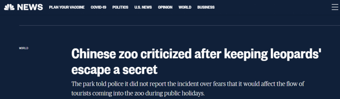 美国全国广播公司说:中国一家动物园因瞒报金钱豹出逃备受批评。