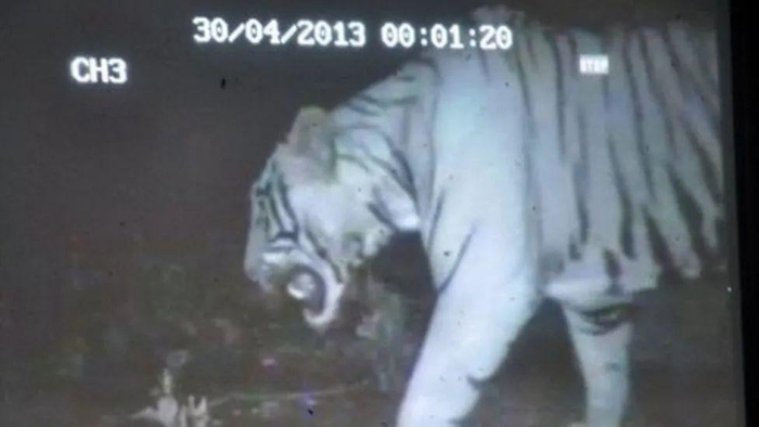 监控画面拍到,这只雄老虎一直在母老虎门外徘徊。图源:BBC