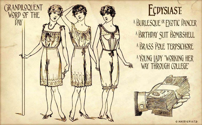 ecdysiast,一种地下娱乐方式的舞者,该词由美国著名讽刺作家亨利·路易斯·‘H·L’·孟肯于19世纪时创造。