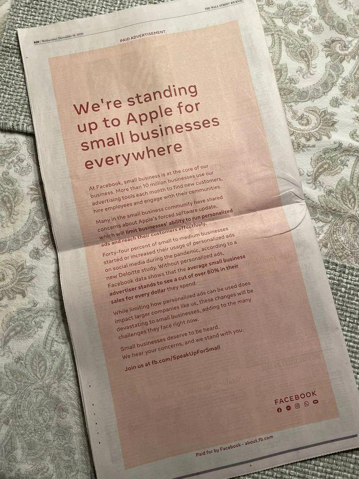 “互相伤害呀”图源:网络再往后就是2020年那场开发者大会了。虽然苹果隐私团队经理斯金纳仅仅用了20秒宣布,公司决定采取全新“隐私采集披露”和“用户许可”政策,但这对脸书来说无疑是赤裸裸的宣战。骂战一触即发。苹果说“只是单纯认为用户有权掌控自己的信息”,脸书就说“苹果才不是为隐私考虑,是为利益”。苹果说“脸书是侵犯基本人权”——该公司在2018年把“隐私是最基本的人权”设为座右铭,脸书就反驳“苹果是在扼杀免费使用的互联网生态,是在谋杀互联网活力”。去年12月,脸书公司甚至买下《纽约时报》等多家纸媒的整版页面,指控苹果新政会伤及多家小微互联网企业。库克因此决定延缓推出该政策,以便给互联网广告业更多时间调整和适应。