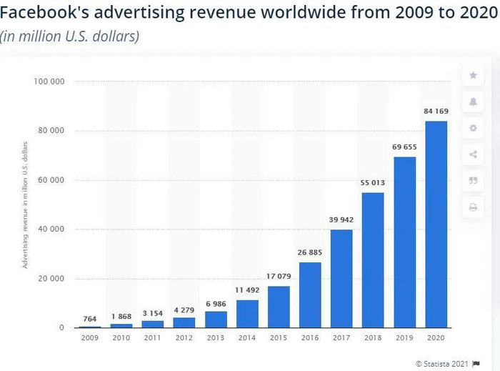 解释扎克伯格为何对苹果新政如此愤怒前,请先回答一个问题:你认为“脸书”是一家什么公司?“社交媒体公司”、“互联网科技公司”……这些答案并不完全正确,因为如果以营收模式看,脸书应该算一家广告公司。根据公开数据,2020财年,广告收入占到脸书全球总收入的97.9%,超过840亿美元。