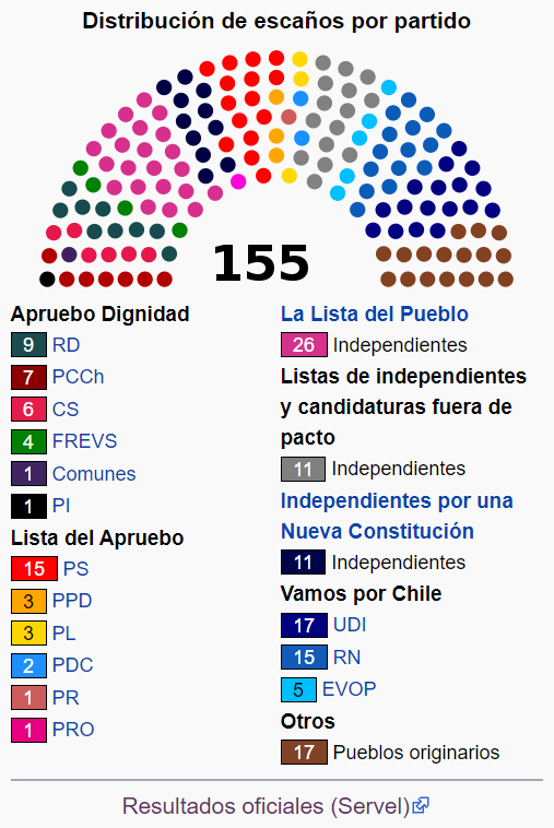 最终的选举结果表明,新的立宪会议由77位女性代表和78位男性代表组成,这甚至还是配额调整后的结果,而传统党团遭遇历史性惨败:后皮诺切特时代轮流执政智利的左右两派,加到一起仅获得了155席中的62个,其中皮涅拉所属政党UDI仅获17席,除非有奇迹能够帮助皮涅拉重建联合三分之二会议席位的新党团联盟——这至少意味着除独立代表外的所有人——未来全面失去立宪议程控制权已成定局。