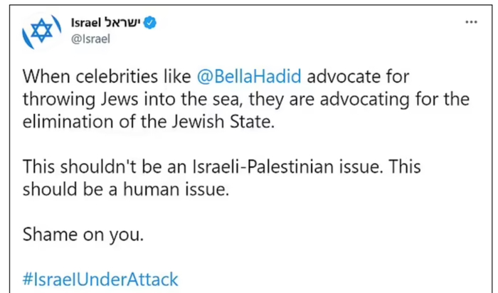 超模姐妹在Ins的内容引发了以色列官方推特的猛烈抨击,以色列的国家官方推特上发微博,点名提姓的直接说了贝拉·哈迪德:“当像贝拉·哈迪德这样的名人提议将犹太人扔到海里时,他们实际上是在支持消灭犹太国家。这不是一个以色列-巴勒斯坦的冲突,这是一个人性的问题。为你感到耻辱!”