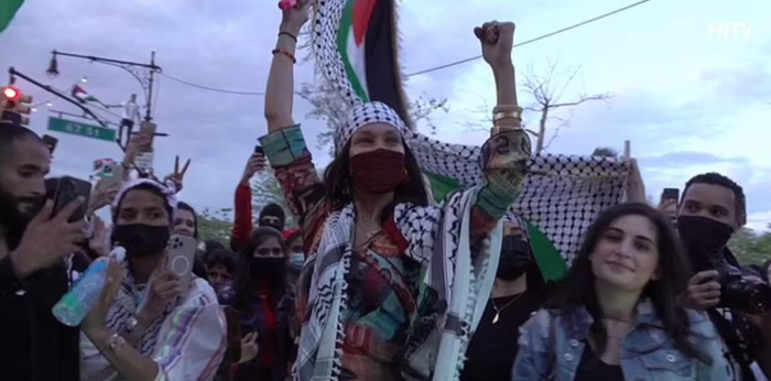 上周六,贝拉·哈迪德参加了在纽约布鲁克林的抗议活动,当天哈迪德身穿着巴勒斯坦的传统服饰Keffiyeh,在上千的巴勒斯坦支持者中非常显眼。之后,贝拉在自己的Ins故事中,用一段漫画表示出自己的态度:漫画中以色列是“占领者”,而巴勒斯坦人则“被压迫”。