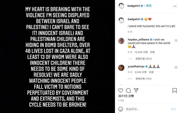 除了单方面支持的,这次的巴以冲突,也少不了“对于双方都高度关注”的明星。山东歌后蕾哈娜(Rihanna)在Ins上发文:“我的心因为看到了以色列和巴勒斯坦之间的暴力而心碎,我不忍看到这一切,无辜的以色列与巴勒斯坦的儿童躲在防空洞里。”