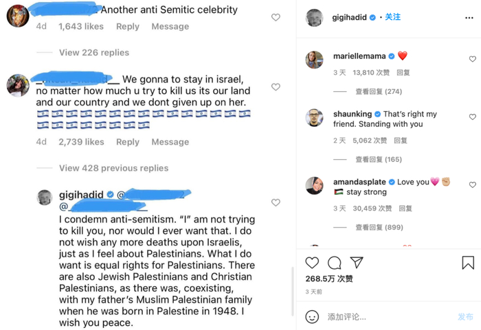 在同姐姐站在一条战线上之后,吉吉的Ins账号也被多位支持以色列的网友攻陷,身处舆论焦点的她还是发布了一条内容来重新阐述自己的立场。
