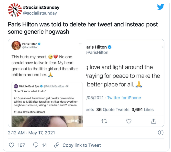 另一位出来发声的是老牌儿名媛帕里斯·希尔顿,她在推上转发了《卫报》的内容,这篇文章中以色列表态在局势“完全和平”之前,不会停止对于加沙的进攻。希尔顿的转发语是:“这真令人伤心,这一切需要停止!然后配上#拯救巴勒斯坦 #加沙遭受攻击 #停止屠杀”的标签。
