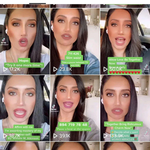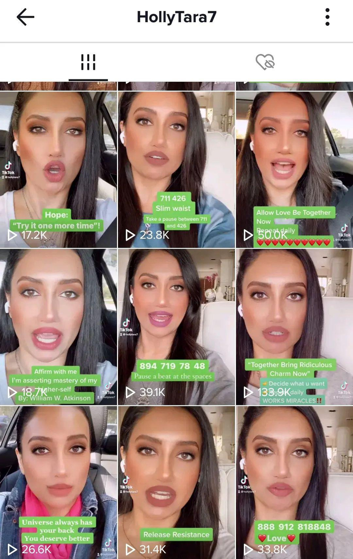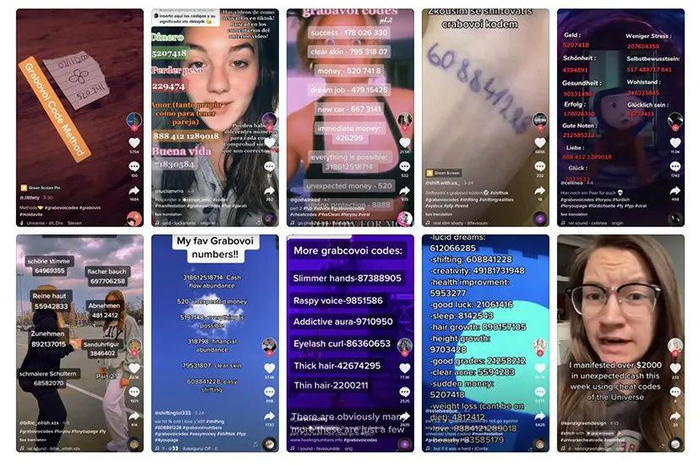朋友,你听说过能让人美梦成真的“作弊代码”(Cheat Codes)吗?“各位,这款‘作弊代码’能让您的腰变瘦:711426,711426,711426。”视频里,一位用户名为“HollyTara7”的美女直勾勾地盯着屏幕,机械地重复数字,仿佛没有感情的复读机。点进她的Tiktok主页,你还可以看到她如何一本正经地分享哪些“作弊代码”可以帮人找工作、买房子、遇真爱、赚大钱。