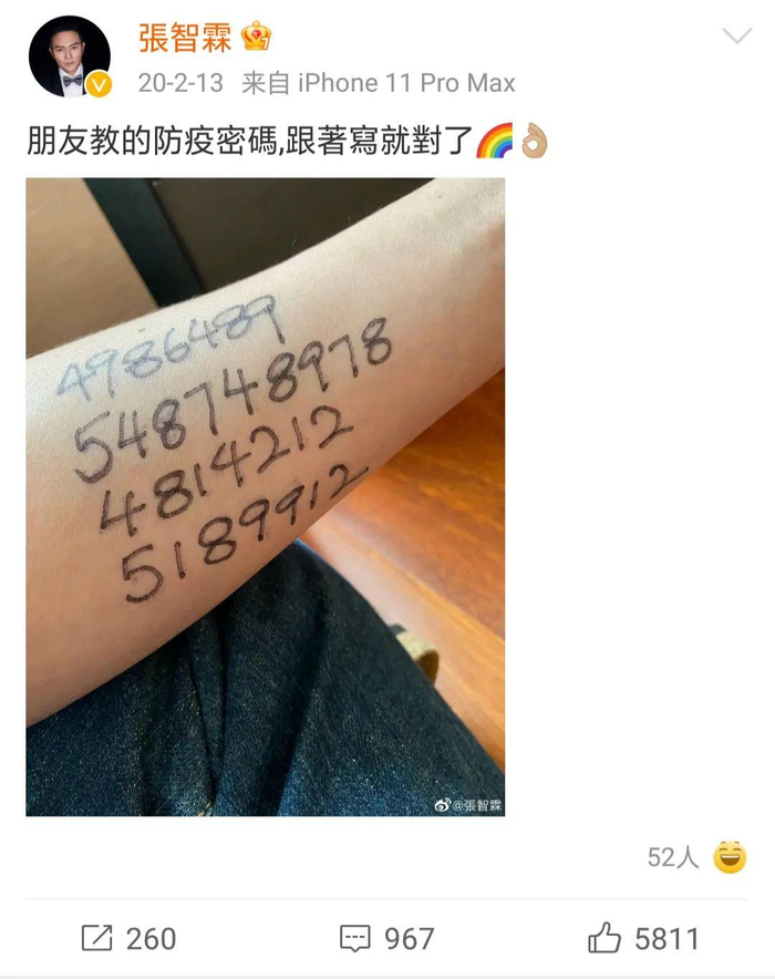 张智霖去年2月的微博,评论下还有粉丝效仿。图源:网络比如港星张智霖,在去年年初疫情刚爆发时,曾在微博po出自己写满数字的手臂,并称这是“朋友教的防疫密码,跟着写就对了”。一开始网友还以为他被绑架了在写暗号求救,后来才被扒出来号码出自格拉博沃伊之手,其中有两串还是专为抵抗新冠病毒新设计的。那么,这些号码又是怎么被格拉博沃伊发明出来的呢?按照格拉博沃伊的说法,他认为宇宙万物都有属于自己的电磁场,每个电磁场的振动频率可以用特定的数字序列表示出来。为此他发明了一种无线电机器,可以测出每种事物对应的号码。