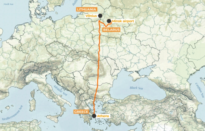 延误是因为突如其来的改航迫降。当航班飞至立陶宛与白俄罗斯接壤处附近时,白俄罗斯称机上有来自哈马斯的“炸弹威胁”,要求其紧急降落在白俄罗斯首都明斯克机场,并派出米格战斗机伴飞。