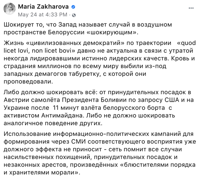 扎哈罗娃在脸书上讽刺西方称,“要么,他们也应该震惊于玻利维亚总统专机因美国要求(注:因怀疑飞机上有中情局前雇员斯诺登)而在奥地利被迫降落,以及从白俄罗斯起飞11分钟的飞机因为有反政府人士而在乌克兰被迫降落。要么,他们就该对同样的事情都毫不震惊。”