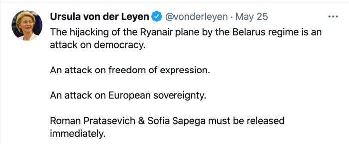 欧委会主席冯德莱恩表示,“劫机”行为令人发指且非法,必须被制裁。欧盟很快拿出举措,禁止白俄罗斯航班进入欧盟27国空域,同时敦促欧盟各家航空公司,避开白俄罗斯领空飞行。