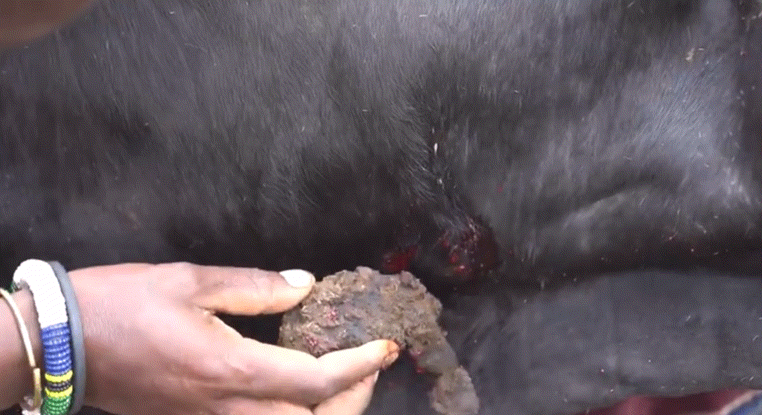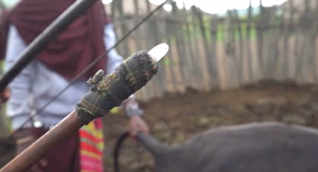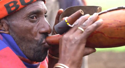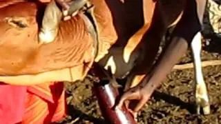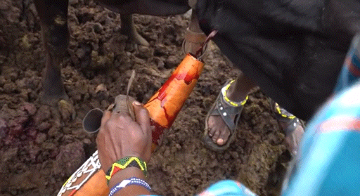 随后数位壮硕的马赛族男青年便会控制住另外一头牛,并用特制的箭头戳向牛颈处的静脉,之后血液将会流入刚接完牛奶的葫芦里。