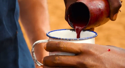 马赛族人往往会让你将这一杯牛饮尽快当场饮下,因为时间久了血会变凉,变凉就会结块进而影响口感。无论是再怎么逞凶斗恶的游客在这杯牛血饮料前也会变得异常得温顺,它能让这些人暂时抛却在现代社会中所滋生出的虚伪与做作,重新感受一回那饮血茹毛的蛮荒年代所带来的官能冲击。