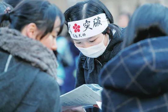 东京的考生头上戴着祈求神明保佑考试通过的“钵卷”。图源:视觉中国