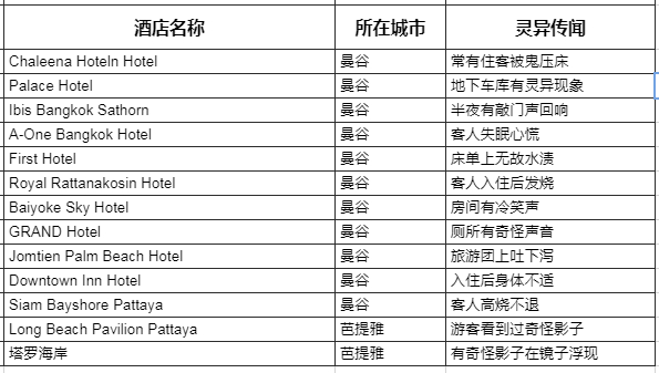 带着溯本求源的态度,我把所有能搜到的闹鬼酒店列了个Excel,发现几乎包揽了泰国各个旅游景区。