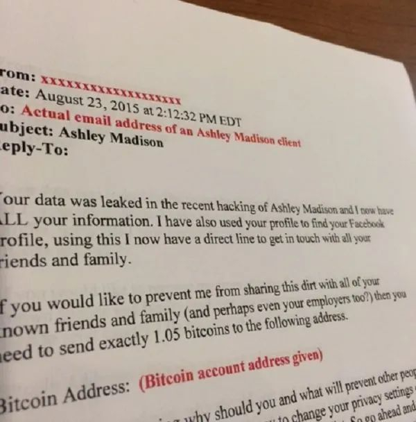 “我手中有你在Ashley Madison网站完整的个人资料和约会证据,如果想阻止我和你的家人分享这些污垢,你需要将 1.05 个比特币发送到以下地址。”接到这个陌生电话的时候,安东尼正在陪老婆散步。“如果你没有在两小时内采取行动,我会通过社交媒体和你朋友还有家人在线共享——当然还有你的约会清单。”勒索者继续说道。