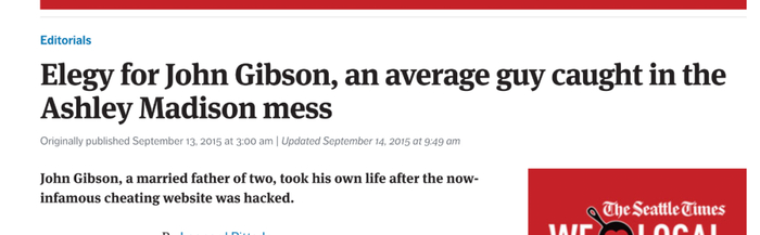两名警察被黑客公布为外遇网站用户后自杀网络黑客以道德的名义公布的名单并未引起人们的喝彩,人们评价他们的行为看起来更像是一次撒旦的攻击,而不是正义的十字军东征。作家布莱特说:“侵犯一无所知的人的隐私来捍卫道德依然是不道德的。”