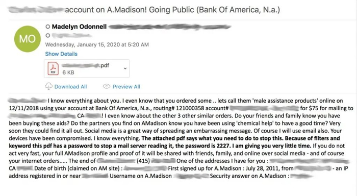 比起在黑客事件中直接败露的不幸,那些尚未被伴侣发现的人们更加悲惨。一些骗子利用Ashley Madison被泄露的数据,近年来不间断对用户进行个性化骚扰。