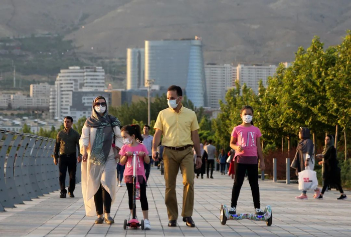 ◆2020年5月28日,新冠疫情期间,伊朗首都德黑兰的一家人在奇加尔人工湖附近散步