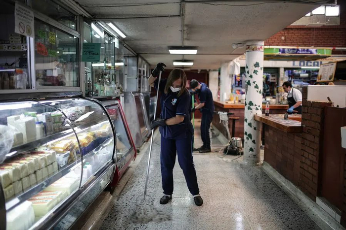 进入隔离状态前,哥伦比亚一家餐厅的员工在进行清洁工作