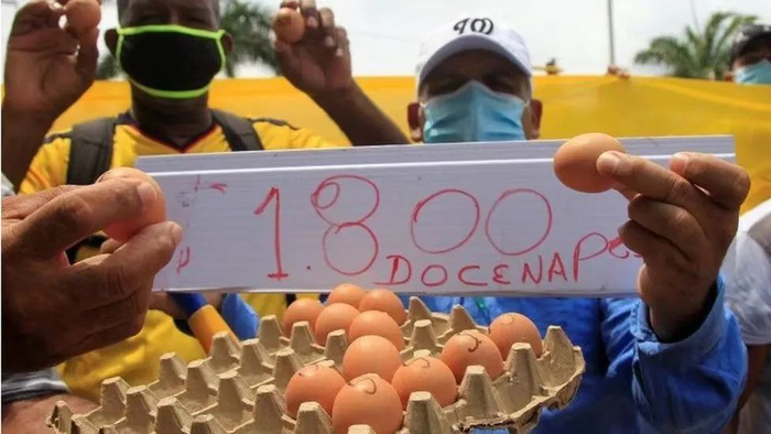 哥伦比亚民众手举鸡蛋和写着“1800比索”的牌子,讽刺财政部长不知道鸡蛋价格