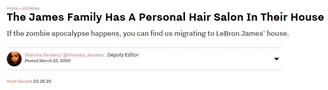 詹姆斯家中有一个私人美发沙龙如果丧尸末世来临,你会发现我们移居到勒布朗·詹姆斯家他的御用理发师尼克·卡斯特马诺斯声称“这是我最难剪的发型,整套做完将近一小时”。但尼克没想到,本来是不得已的秃头补救方式,却能成为刻意为之的潮流密码。“事实表明,审美就是毫无操守和立场的皮条客。当一个人影响力足够强大,就能扭转放风评。”